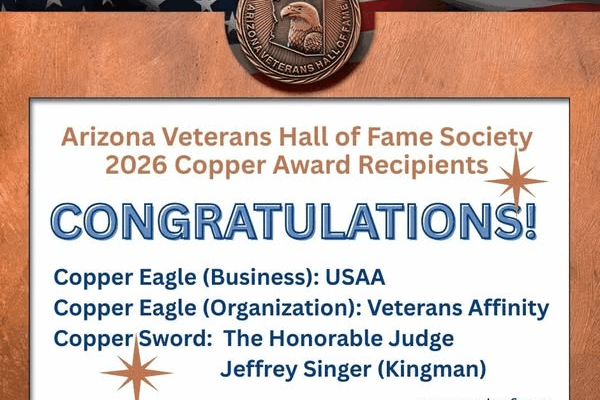 Kingman City Magistrate Jeffrey Singer has been named the 2026 recipient of the prestigious Copper Sword Award by the Arizona Veterans Hall of Fame Society (AVHOFS), recognizing his long-standing commitment to supporting veterans and their successful reintegration into the community.