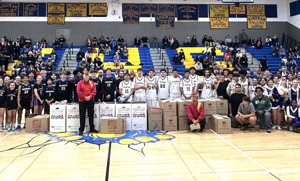Toys for Tots Coordinator Paul Bunn and Marine Corps League Commandant Terry Flanagan posse with students from Kingman High and Kingman Academy High basketball teams.