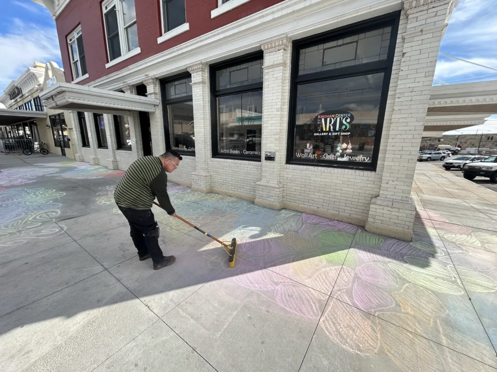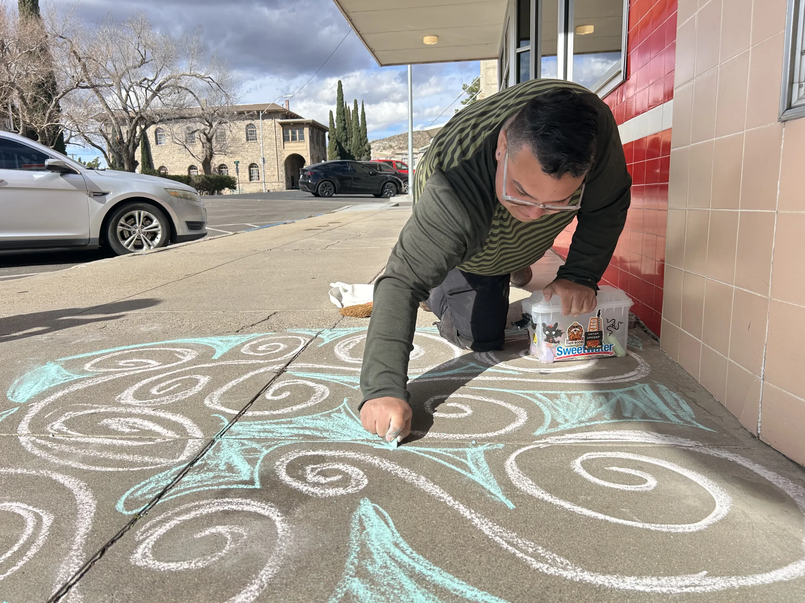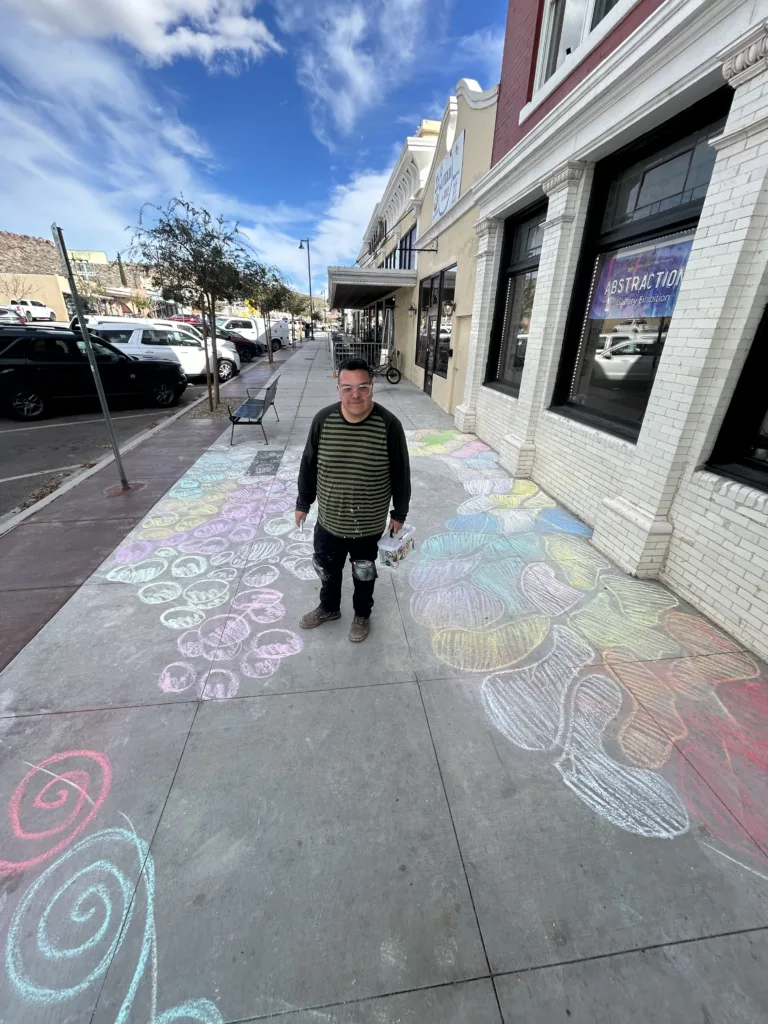 That’s exactly what local artist Luis Tellez spent a good portion of Friday morning and afternoon doing – chalking an assortment of circles, swirls and other abstract designs along the sidewalks around the Kingman Center for the Arts Gallery & Gift Shop in downtown Kingman.