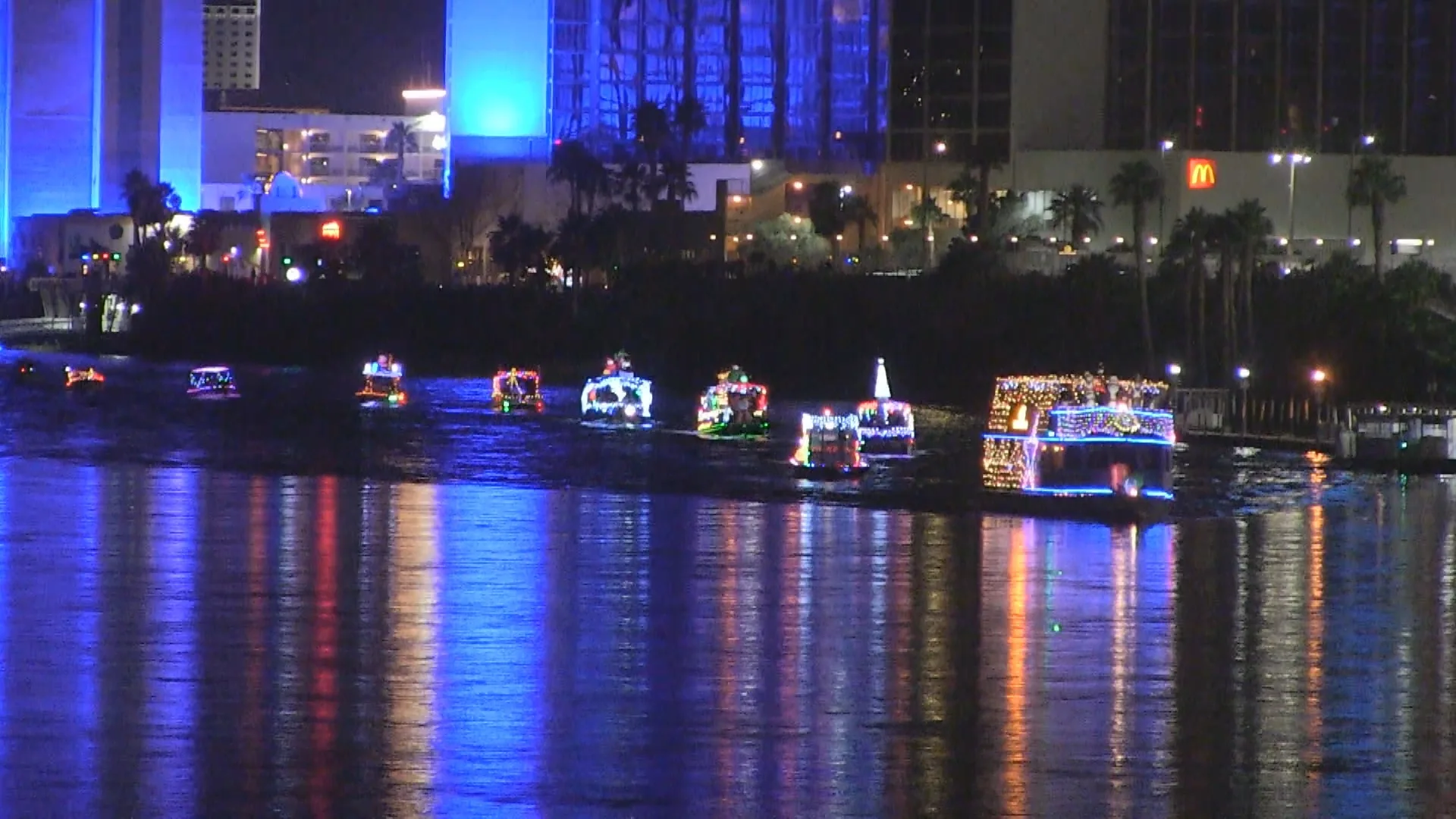 Reindeer, of course, weren’t an option on the river. Instead, Santa’s sleigh was “pulled” by six light‑strung dolphins leading the round trip from the Bullhead Belle to the Laughlin Bridge.