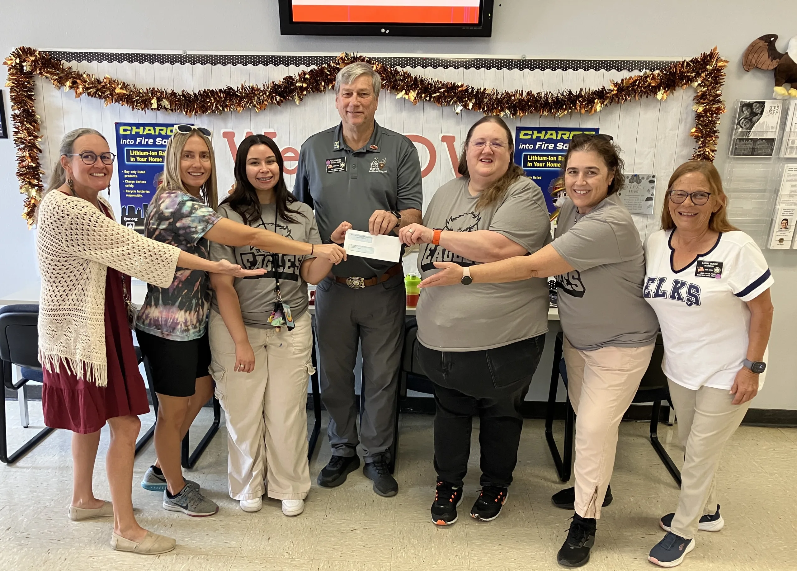 Featured photo: (L–R) Desert Valley teachers Stacie Mallinson (music), Karen Johnson (PE), Bailey Gonzalez (art), Sonyia Roy (library) and Lilijana Radic (STEAM). Elks Bullhead Exalted Ruler Walter Honse (center) and Lodge Secretary Kathy Honse (right) presented the $1,000 grant check in the Desert Valley lobby.