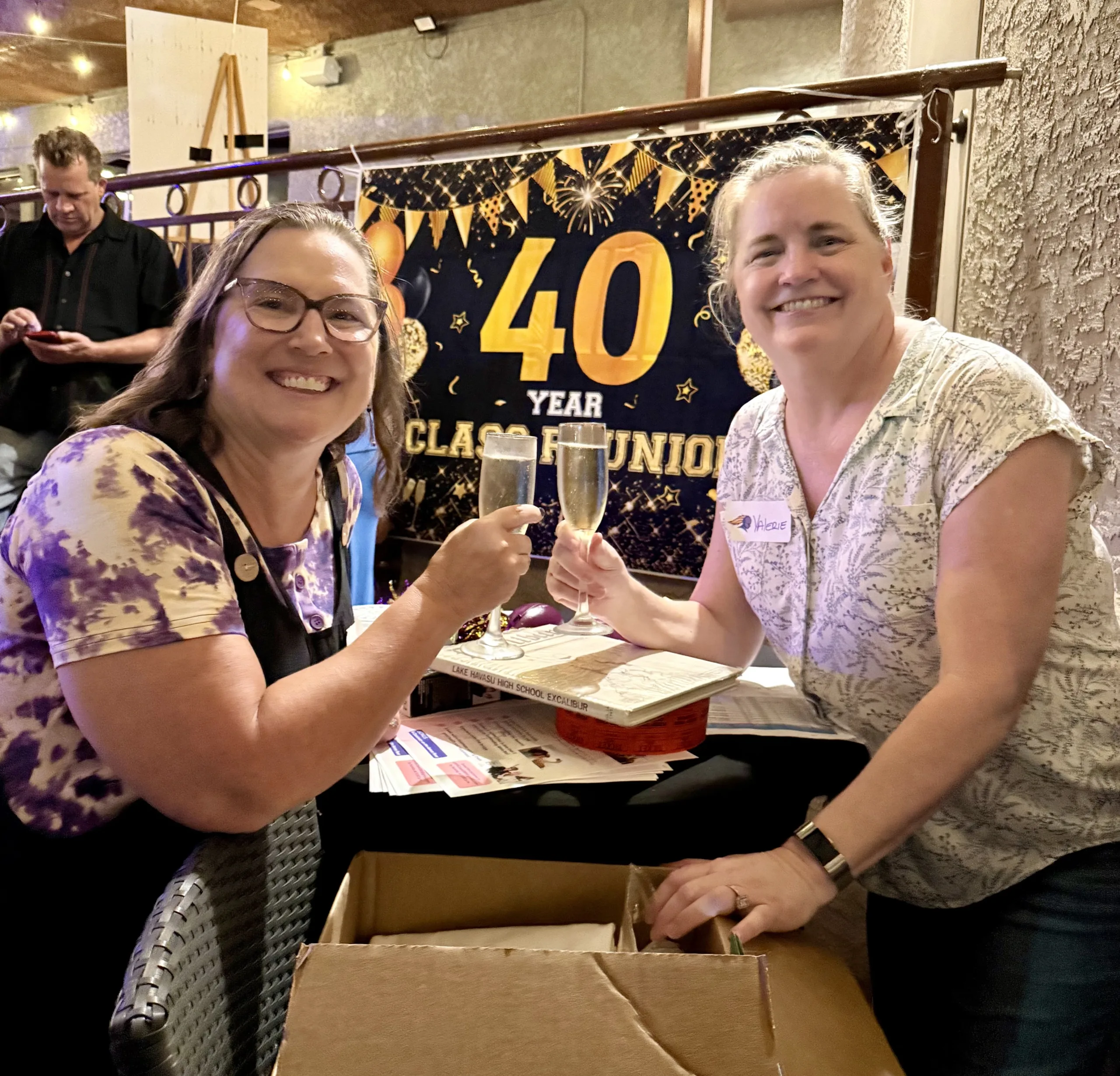 Photo caption: Co-coordinators Jean (VanNeirop) Russell and Valerie (Frahm) Kranz share cheers at LHHS’s Class of 1985 Reunion at London Bridge Resort’s Convention Center. Photo courtesy of Valerie Frahm Kranz.