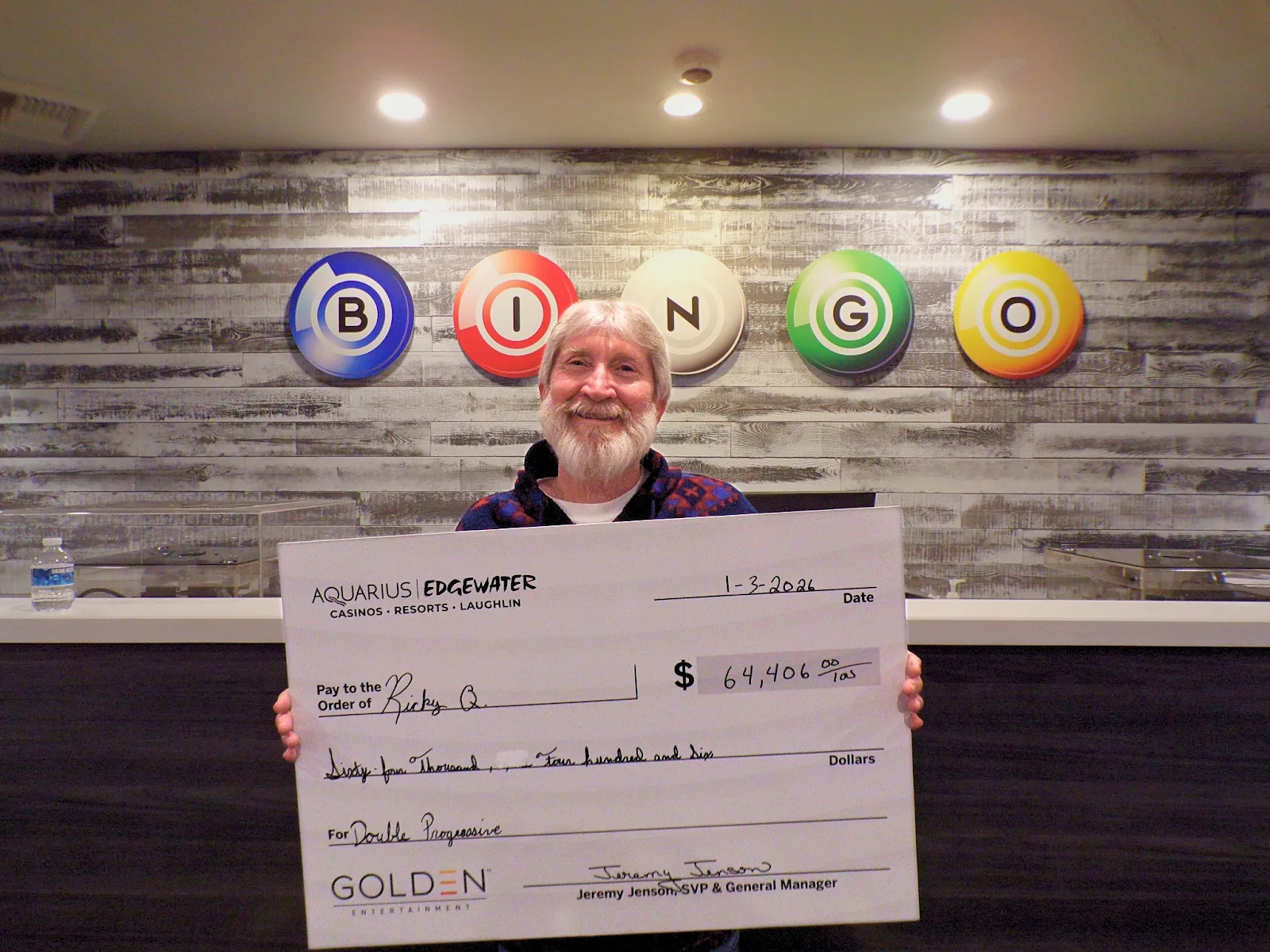 LAUGHLIN, Nev. – A lucky Arizona guest took home a major bingo win after claiming the Double Progressive Bingo Jackpot in the Bingo Room at Edgewater Casino Resort, located at 2020 S. Casino Drive. The player took home the jackpot totaling $64,406 on Saturday, Jan. 3.