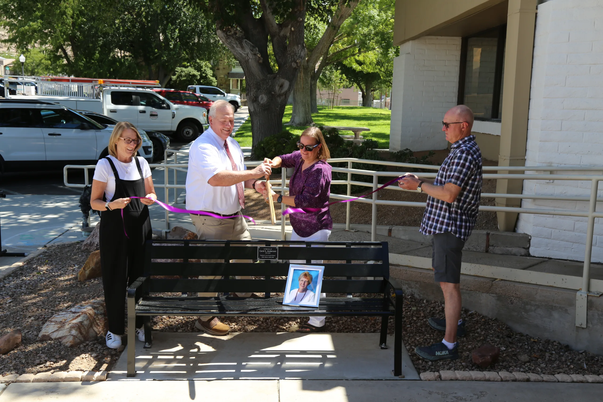 KINGMAN – A ribbon cutting ceremony was held Friday outside Kingman City Hall to dedicate a memorial bench in honor of former Mayor Carol Anderson. The bench was purchased and arranged by Anderson’s family as a tribute to her many years of public service. Kingman Mayor Ken Watkins attended the ceremony to honor Anderson’s legacy and take part in the dedication.
