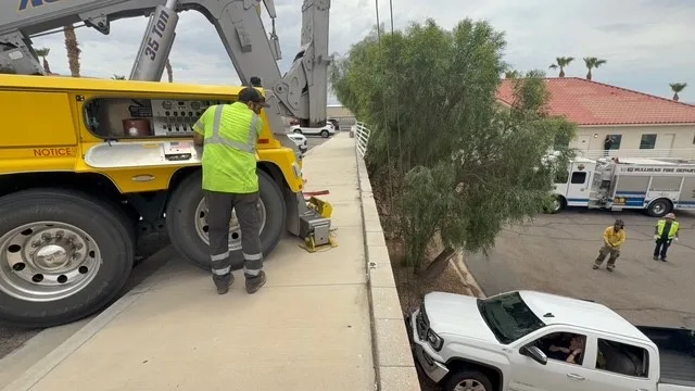 A pickup truck driven by the female reportedly backed out of a parking space, traveled over a curb, broke through a pipe railing, and descended approximately 20 feet down an embankment. Emergency responders arrived promptly at the scene, and both occupants were transported with minor injuries. We would like to extend our sincere thanks to A & G Towing for their assistance during this incident.