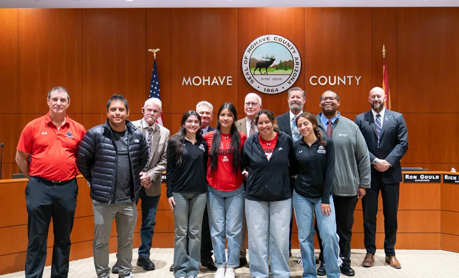 Members of Mohave College leadership, athletics staff and student-athletes attended the Board of Supervisors meeting as the proclamation was presented. The recognition highlights the positive impact of collegiate athletics on student success and community engagement.