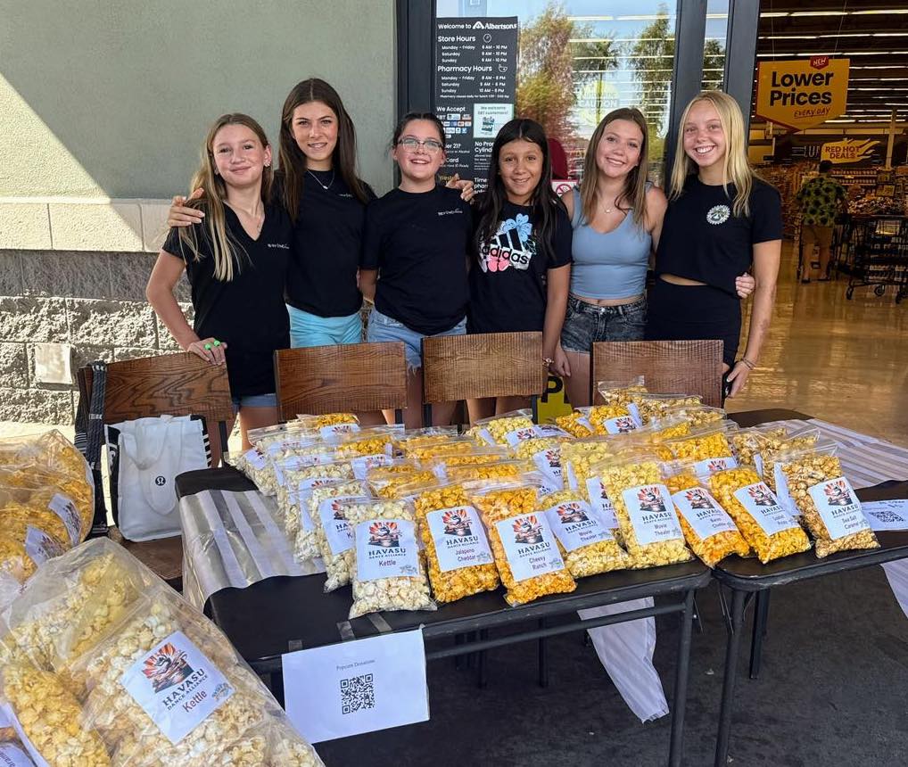 Feature photo description from left to right: Students names: Teagan Sutpen, Charlotte Huizinga, Bailee Horton, Niome Aviles, Sadie Burchett and Kaia Smith. Havasu Dance Alliance students partnered up with We be Poppin’ snacks for one of their many fundraisers in front of Albertsons Grocery Store. Photo courtesy of Janelle Huizinga.