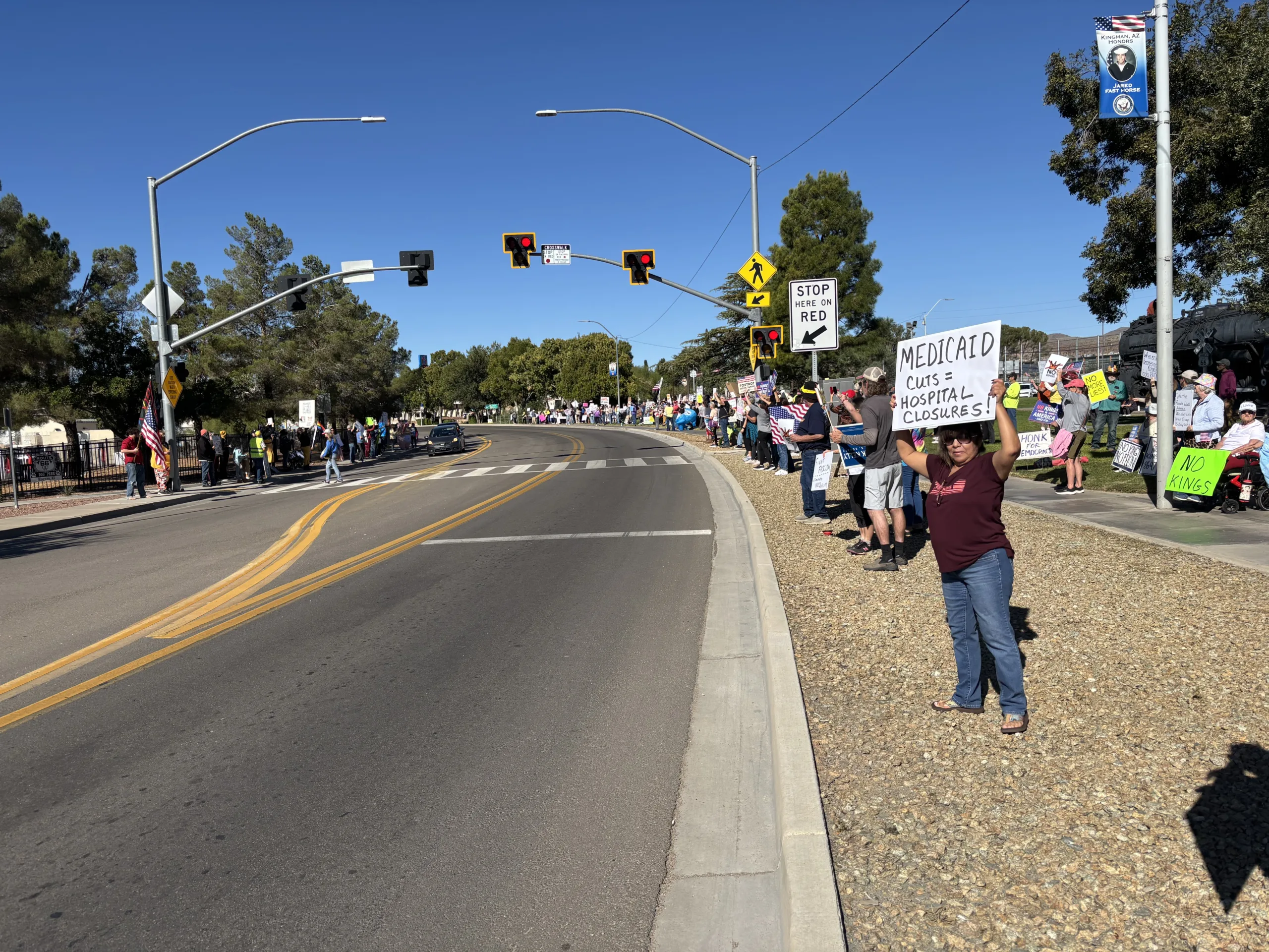 Protesters in Kingman held signs for a variety of issues including healthcare and Medicaid cuts, patriotism and the military, affordability of groceries, free speech, and immigration enforcement.