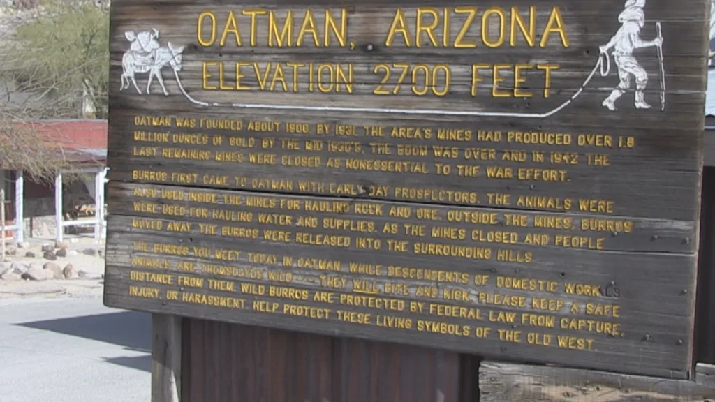 The rise and fall of the gold mining operations, explains the fortunes of the community of Oatman. The approximate value of gold in today’s dollars extracted from the area is over $725,000,000 with the production rise and fall accounting for the population peaking at around 3,500 to the approximately 102 people living there today.