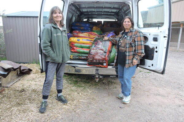 Cherie Dalynn, left, and Chris Marie stand at the rear of the van loaded with the donated dog food, cat food and other donated items that were delivered to Dalynn at the For the Love of Paws domestic animal shelter and sanctuary located on Oatman Highway in Golden Valley on January 6.
