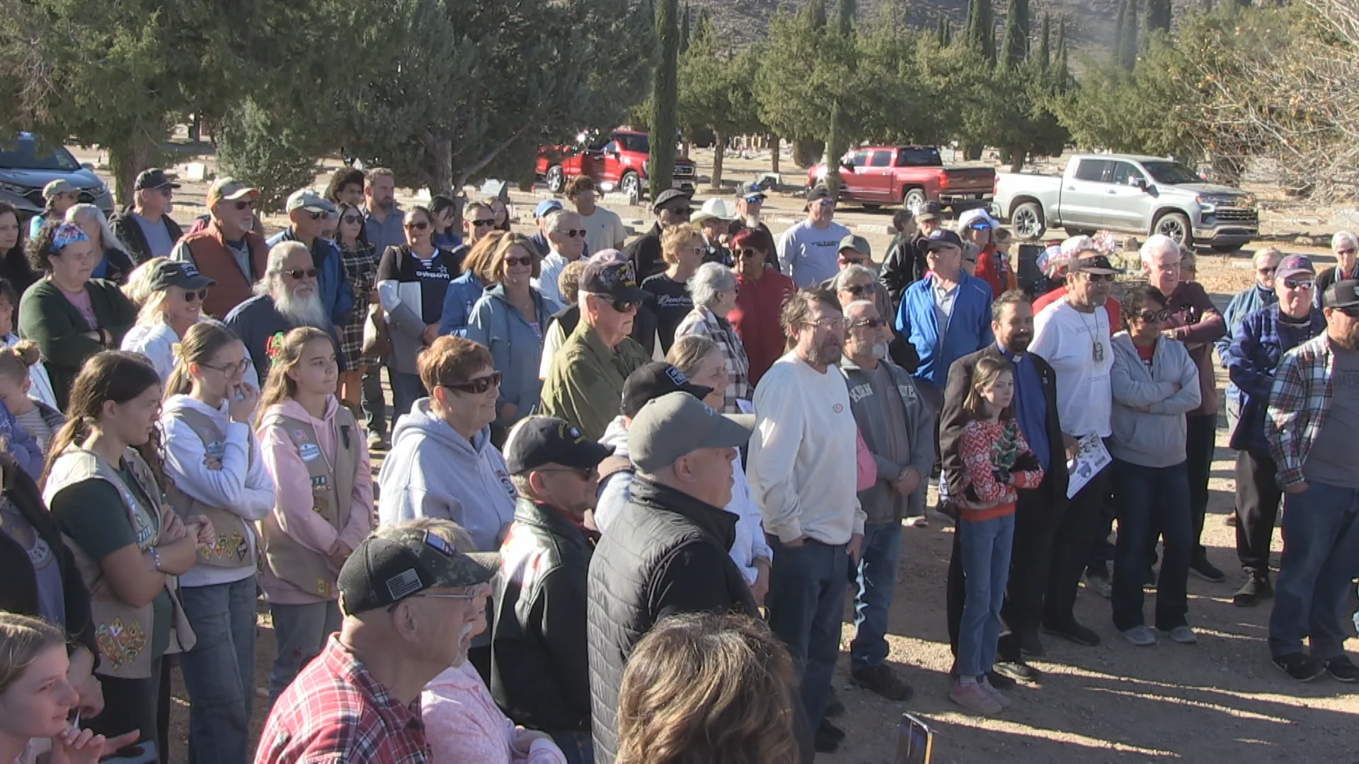 The ceremony opened with a color guard dressed in vintage Marine uniforms. Kingman Mayor Ken Watkins praised the turnout and the organizational work behind the event. Police Chief Rusty Cooper added his tribute to veterans’ families, while Fire Communications Chief Oscar Lopez reminded the crowd of the 11 volunteer firefighters buried at Mountain View who lost their lives in the 1973 train tanker explosion.